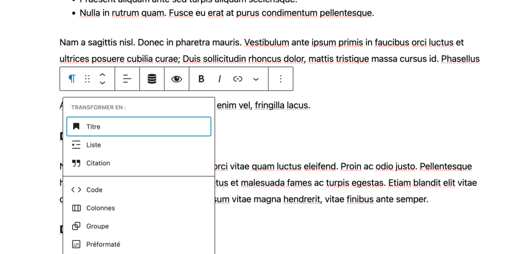 Pour transformer une portion de texte en titre, citation, ou autre, il suffit de sélectionner le texte en question et de cliquer sur le bouton qui se trouve tout à gauche du petit menu contextuel qui s’affiche à l’écran puis de choisir le type de votre choix sous « Transformer en : »