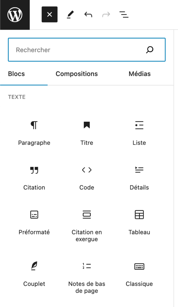 Pour ajouter un bloc de texte, il vous suffit de cliquer sur le petit « + » en haut à gauche et de parcourir la bibliothèque pour sélectionner l’élément de votre choix : Paragraphe, Titre, Liste, Citation,… C’est également depuis cet emplacement que vous pourrez ajouter différents types de médias (image, vidéo, audio,…), des éléments de mise en page, des widgets, etc.