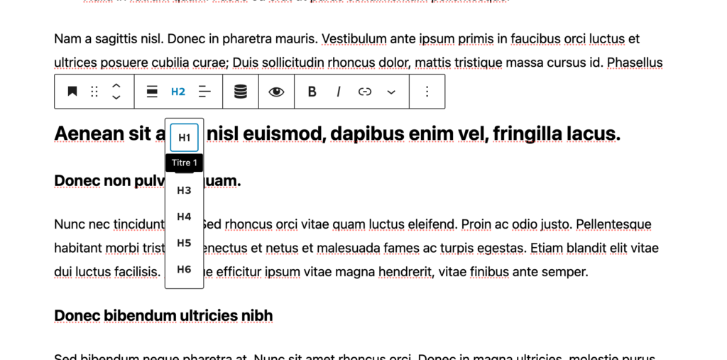 Afin de créer une hiérarchie dans vos titres, pour des raisons de mise en page mais également d’accessibilité, il suffit de positionner votre curseur à l’emplacement où se trouve le titre et de sélectionner un autre niveau de titre (h2, h3, etc.) parmi les options qui s’affichent dans le menu contextuel. En général le titre de niveau h1 est réservé au titre de l’article.