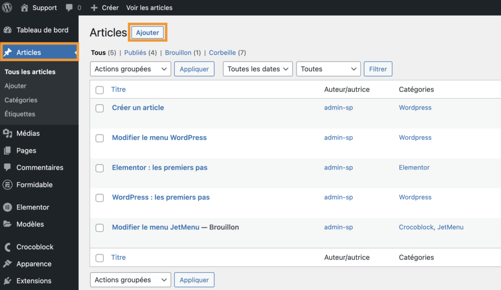 Pour modifier ou créer un article, rendez-vous sur le menu « articles » de la barre latérale gauche de WordPress. Une fois sur cette page, pour créer un article, il vous suffit de cliquer sur « Ajouter ». Pour en modifier un, cliquez simplement sur le nom de l’article.
