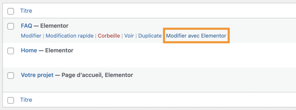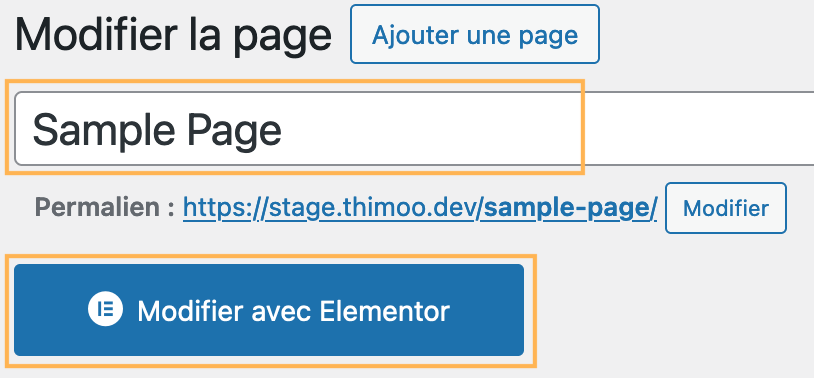 Une fois sur cette page, sélectionnez la page que vous voulez modifier. Vous serez redirigé sur l’éditeur WordPress. Cliquez sur « Modifier avec Elementor ».
