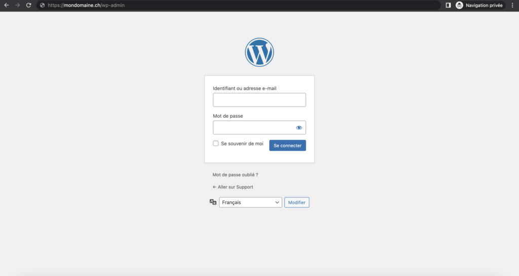 Pour arriver sur la page de connexion, il suffit de rentrer «mondomaine.ch/wp-admin» dans la barre d’adresse de votre navigateur.