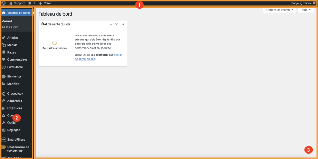Le tableau de bord est la page d’accueil de l’administration de WordPress. L’interface se décompose en 3 parties :